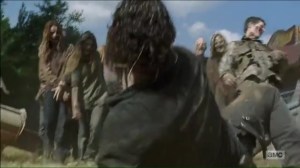 After spotting a terrible CGI deer, Rick climbs the Ferris wheel and prepares to fire, but he falls. He shoots as many walkers as possible, but they soon devour him?