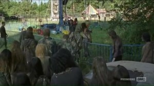 Back at the carnival that time forgot, Rick and Michonne find parts of the field that aren’t closed in, so they’ll have to take care of the walkers slowly. They devise a plan to split up the walkers and close off the open spots, but also keep quiet so as to not alert the other walkers. There’s tons of walkers, so not sure why they don’t consider covering themselves in walker remains, but whatever.