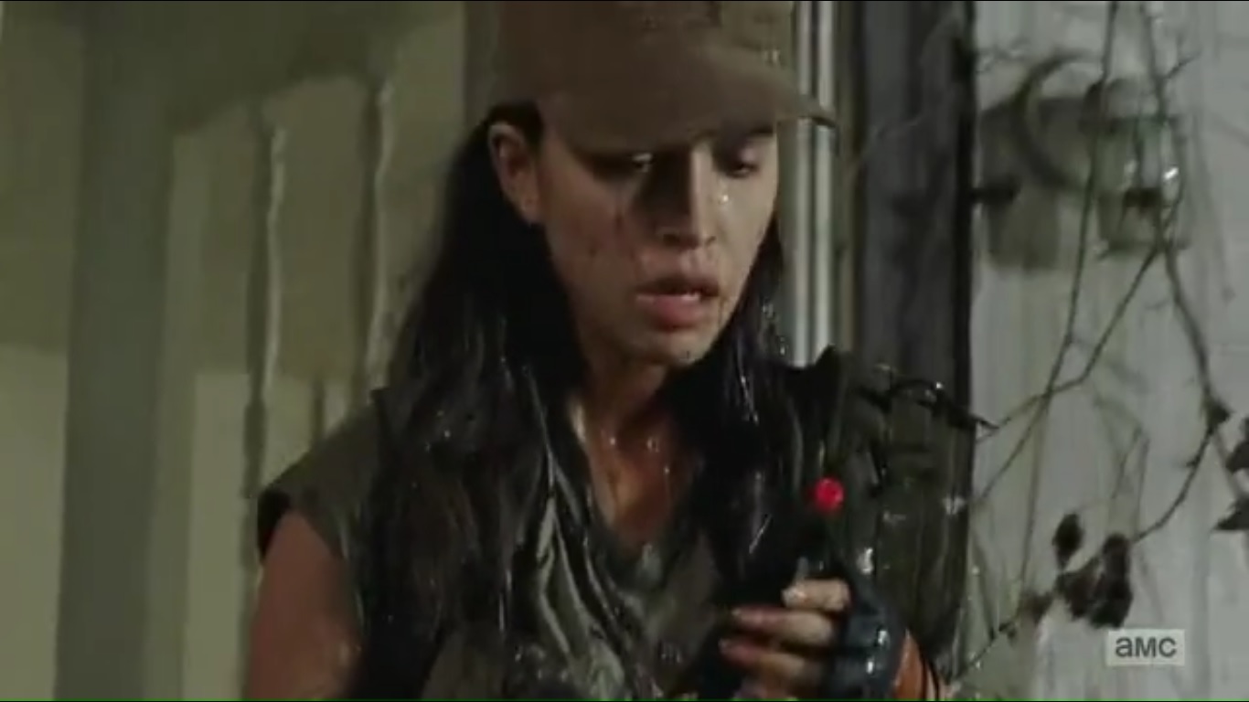 At the same time, Rosita also goes on the hunt and spots a gun at a home when a walker stumbles out. She grabs the gun, but it ends up just being fake gun that you’ll see cosplayers use.