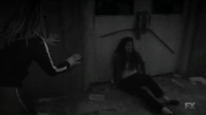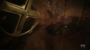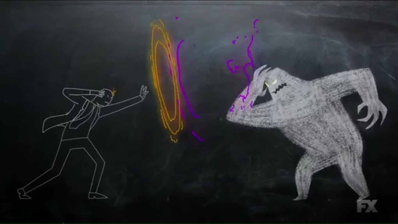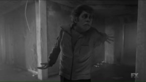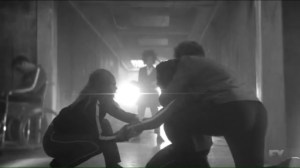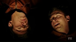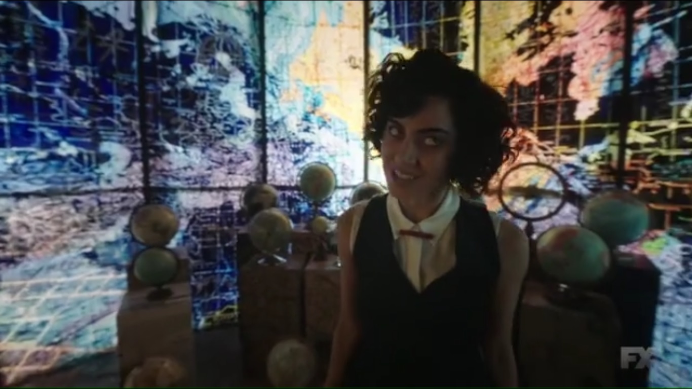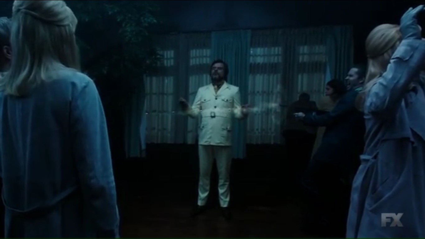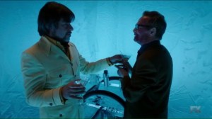 This music continues as David escapes his prison and walks through his memory. Then Legion turns into a silent film as Walter tackles Kerry and knocks off her glasses, forcing her to contend with the illusions around her. Lenny confronts Syd and Kerry, but then takes relieves Walter of his duties by killing him- he dies at the same time in David and Amy’s home.