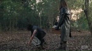 Maggie acknowledges that it’s never too late to change and if Gregory is serious, she’ll come by later so the two can talk. As Maggie continues gardening, Gregory, knife unsheathed, approaches her and has a look on his face, but decides against whatever he had planned. Then a walker approaches from the woods. Maggie offers to take care of it, but Gregory insists that he do it. He’s unable to, though, so Maggie takes care of it.