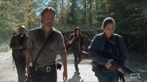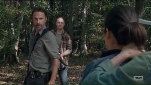But then he’s surprised by a walker from behind, so Maggie saves his ass. Other passing Hilltop members remark that Gregory told them different about how many times he’s killed walkers.