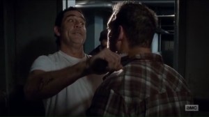 Instead of saying how thirsty she is, Sasha headbutts David. Good one, Sasha, but fighting will just make this last longer. Then Negan arrives out of nowhere and doesn’t like that David was about to rape Sasha. No, he doesn’t like that all. That’s unacceptable behavior, as rape is against the rules at the Sanctuary. He’d hate to be at a place where that’s allowed. So Negan pulls out a blade and tells David that he crossed a line.