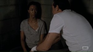 Eugene then tells Sasha from the other side of the door that she made the right choice. Sasha admits that she was wrong- she’s been trying to figure out what to do while the others are getting hurt, but she said yes to Negan and is still trapped. Eugene will help her get used to life here. Sasha asks Eugene to get her a weapon because she knows Negan will use her against the others. She’d rather die than let that happen.
