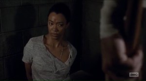 Sasha’s raid at the Sanctuary didn’t go so well. In fact, she’s being held in a cell and asks a visiting Savior, David, for some water. He asks if she remembers her from last night, but she doesn’t. He gave the rope to the Saviors that tied up Sasha and notes that there are many things you can do with rope.