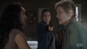 The others corner the rest of the Oceanside group. Rick addresses the women and stresses to them that no one needs to get hurt since this is just about the guns, but then Natania enters with Tara, who yells for Michonne to stand down and not fire. Cyndie tells the women about Tara’s plan, but Natania won’t let her group lose more. Even still, Tara and company will win with or without Oceanside- just their guns.