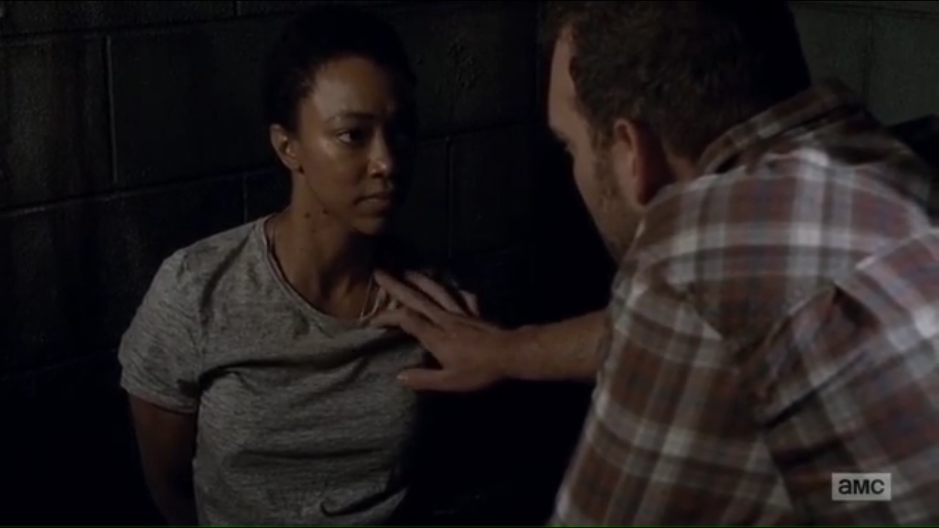 Eugene then tells Sasha from the other side of the door that she made the right choice. Sasha admits that she was wrong- she’s been trying to figure out what to do while the others are getting hurt, but she said yes to Negan and is still trapped. Eugene will help her get used to life here. Sasha asks Eugene to get her a weapon because she knows Negan will use her against the others. She’d rather die than let that happen.