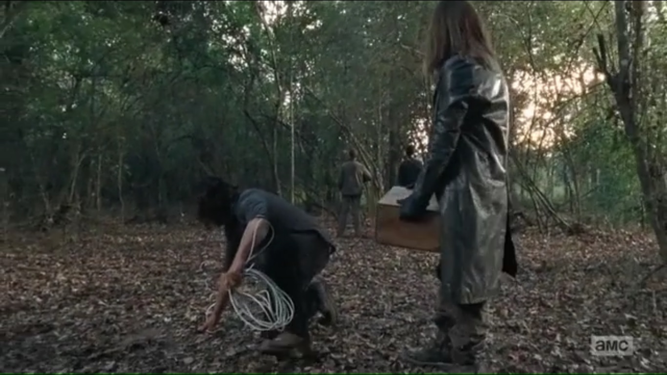 Michonne scales a tree and is told to wait for the signal while Jesus and Daryl plant dynamite. Jesus laments not stopping Sasha and Rosita, but Daryl is confident that the two are more than capable of taking care of themselves. Aaron thanks Eric for being out, but Eric doesn’t want to watch Aaron take any more lickings, so of course he’s going to join in the effort.