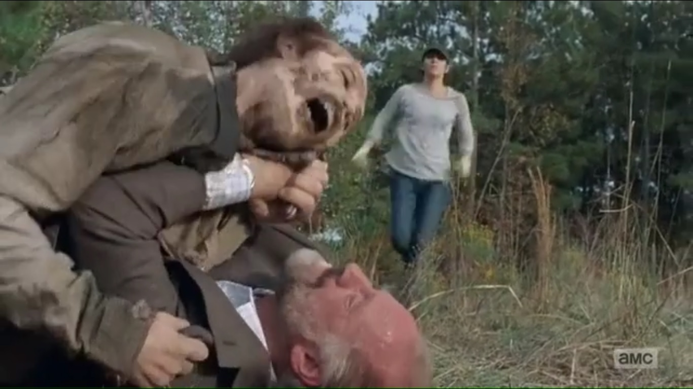 The bit on cowardice comes through Gregory, as we’ve seen before, but we see here that he’s painted himself as a capable fighter against walkers. But what he told his followers differs from what we saw when confronted by a walker. He couldn’t even handle one and had to fall back on the pregnant woman he doesn’t want encroaching on his territory.