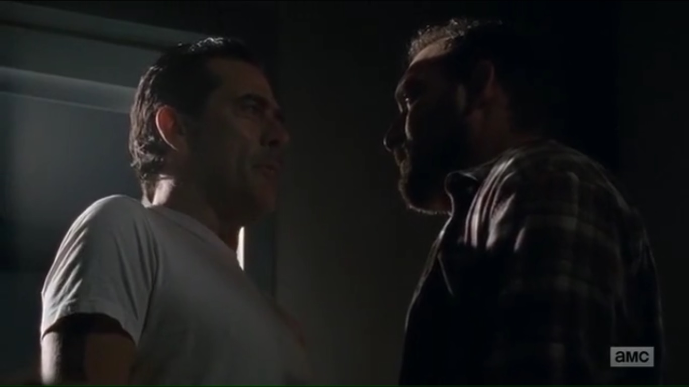 Instead of saying how thirsty she is, Sasha headbutts David. Good one, Sasha, but fighting will just make this last longer. Then Negan arrives out of nowhere and doesn’t like that David was about to rape Sasha. No, he doesn’t like that all. That’s unacceptable behavior, as rape is against the rules at the Sanctuary. He’d hate to be at a place where that’s allowed. So Negan pulls out a blade and tells David that he crossed a line.