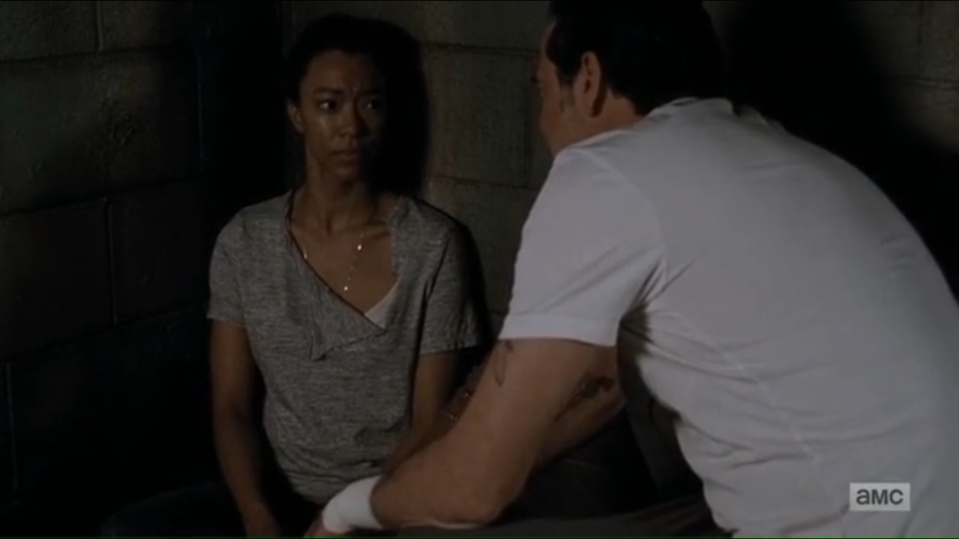 He sets the knife at Sasha’s feet and beckons her to free herself and try to kill him, but that’s not the smartest move. She could slit her wrists, do nothing, or wait for David to reanimate- that or stop David from coming back. Negan, though, is a man short and would like to put Sasha to work since she’s such a great shot. He knows that’s hard for Sasha to picture, given what he did, but everyone has to get over shit in their life.
