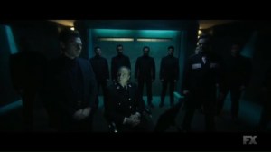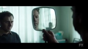 The episode begins with The Interrogator, now hospitalized, thinking back to his session with David Haller. He soon regains consciousness as his husband, played by Keir O’Donnell, and their son, come to his side. The Interrogator’s bandages are removed and half his face is now scarred. He sees his new, hideous look in the mirror.
