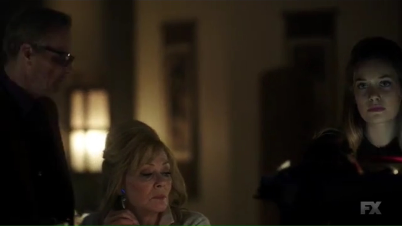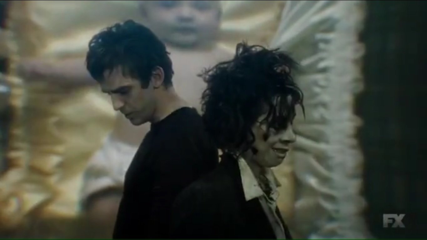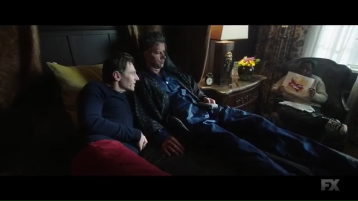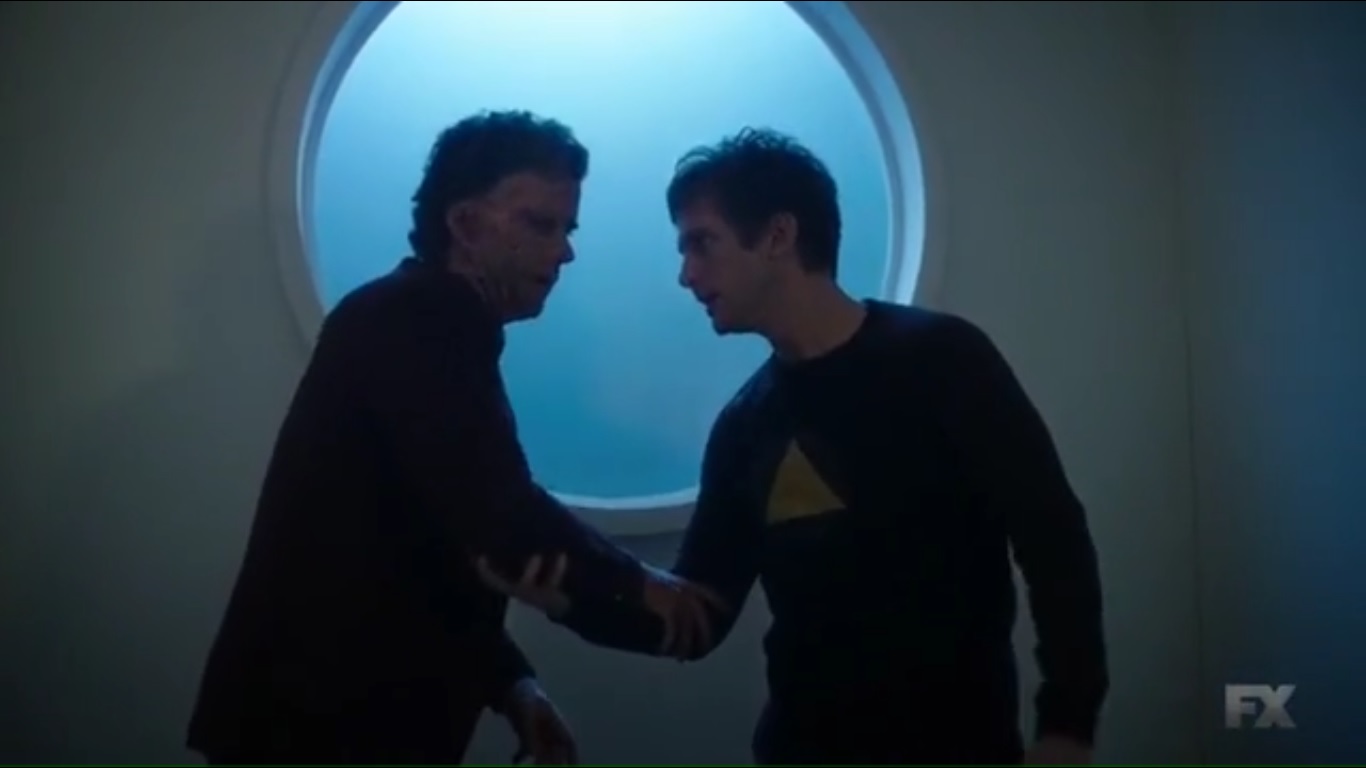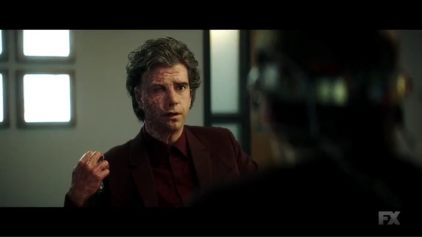 The episode begins with The Interrogator, now hospitalized, thinking back to his session with David Haller. He soon regains consciousness as his husband, played by Keir O’Donnell, and their son, come to his side. The Interrogator’s bandages are removed and half his face is now scarred. He sees his new, hideous look in the mirror.