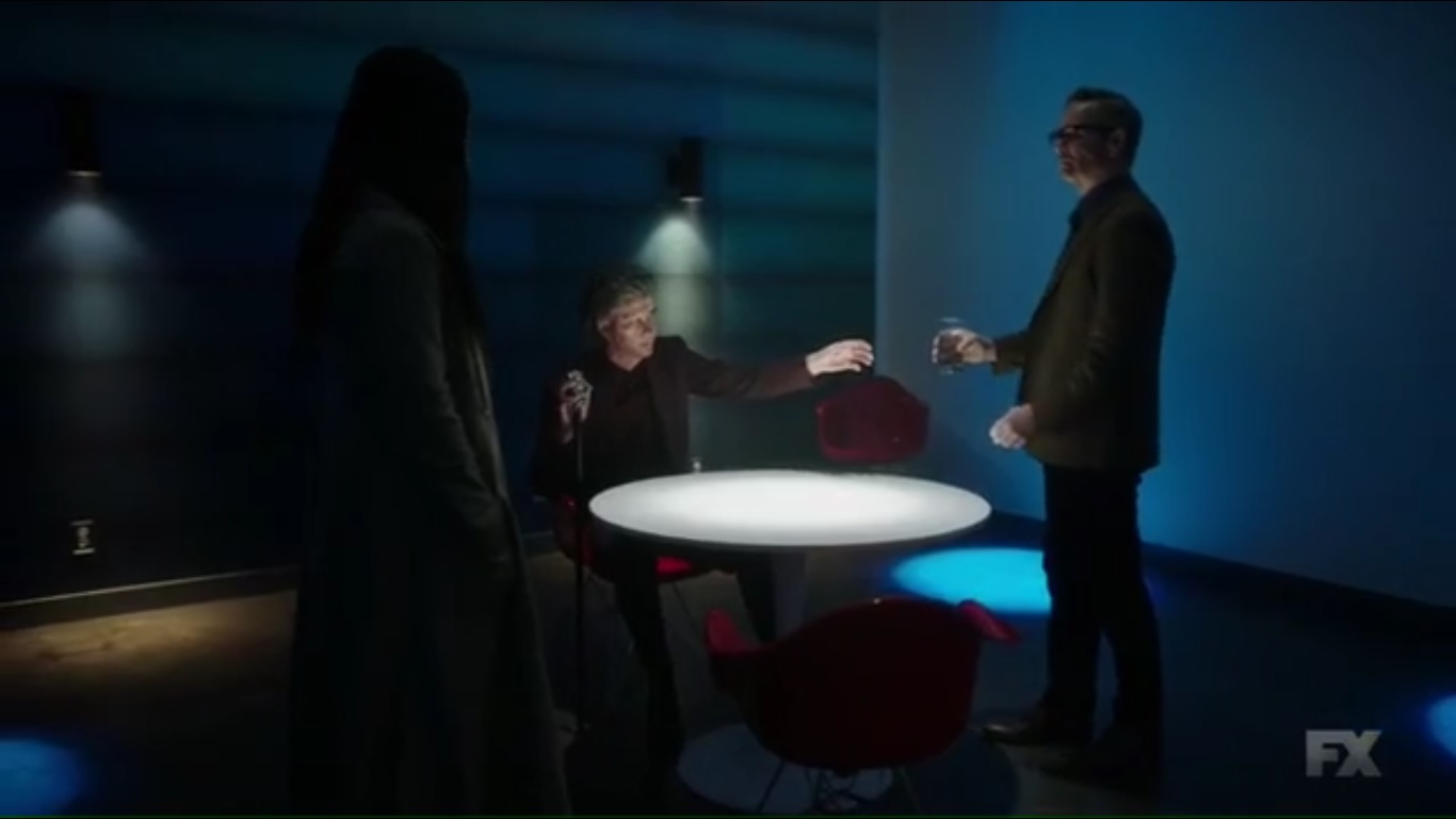 Syd then finds herself in the white room, where Lenny, now looking more grotesque and Beetlejuice-like, crawls out of the bed. As the room grows red, Lenny morphs into the Shadow King and tells Syd that she’s going to help her. As for how Lenny is here, well, when Syd was in David’s mind, Lenny, in turn, was in hers and she knows that Syd can hear her voice.