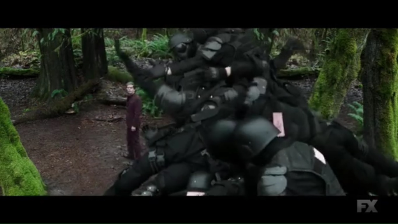 From there, we cut to the present as The Interrogator and Division Three soldiers encounter David and the rest of Summerfield in the forest. But David is ready. Using his powers, he stacks the soldiers into a large Jenga-esque tower. He instructs Ptonomy to lower his gun and then tells The Interrogator that he agrees with him- they do indeed need to talk.