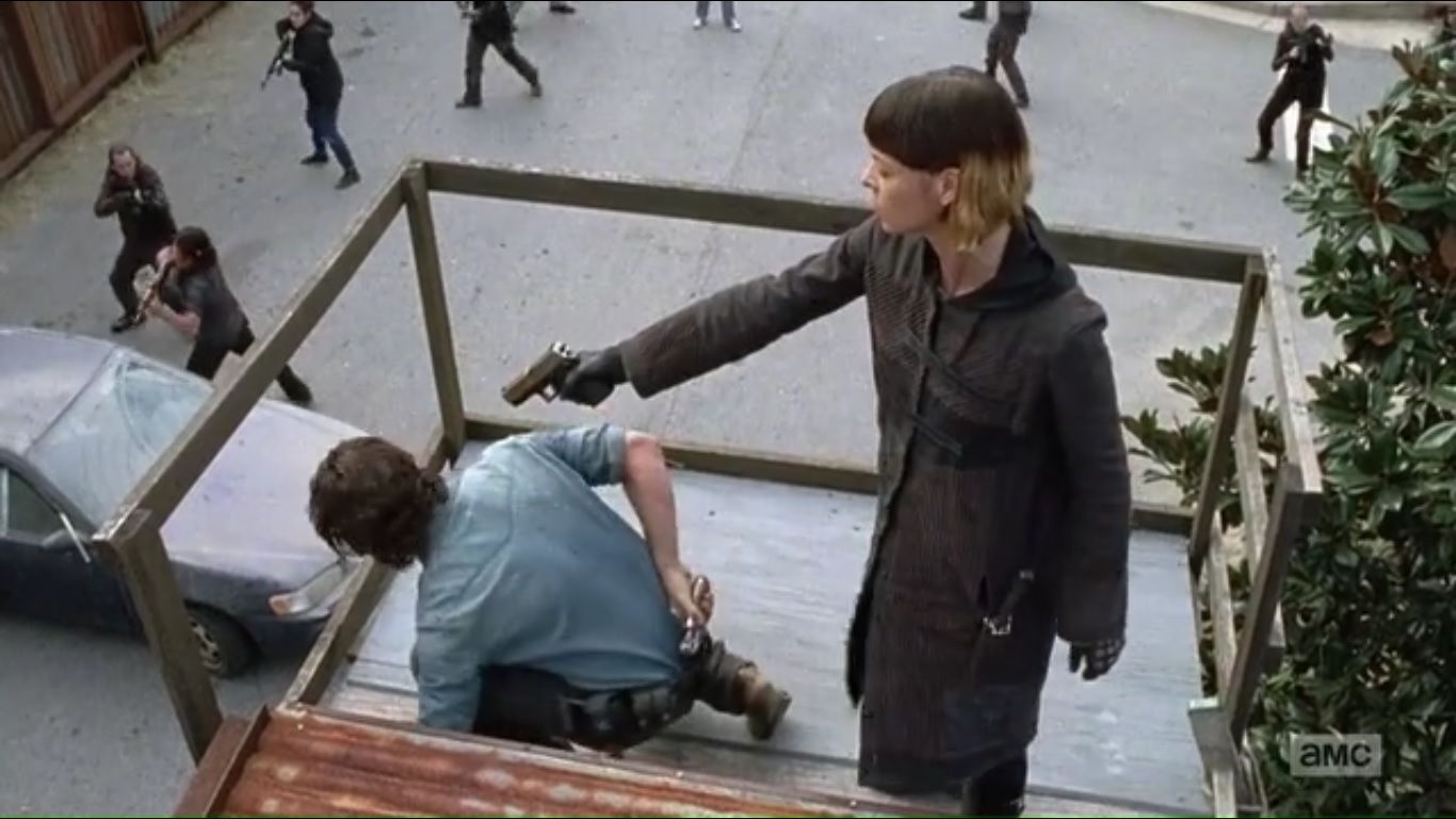 The shootout continues with Jadis leading Rick to the Saviors, who somehow managed to get their hands on Carl. Rick is forced on his knees next to his son and Negan arranges for Jadis to receive 10 instead of 12 guns.