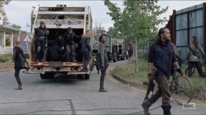 So Rick and the others lead the Junkyard Gang, who come on bikes and actual dump trucks, to the Alexandria Safe Zone. The Junkyard folks arrive in dump trucks. The joke writes itself, people.