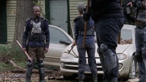 Ezekiel and some Kingdom warriors find a row of shopping carts blocking the road. Morgan, now armed with a spear, tells Carol that he plans to ambush the Saviors on his own. Although if Morgan does this and the Saviors find out, they’ll think it was the Kingdom and, as a result, the Kingdom could lose its advantage. Ezekiel asks Morgan if he wants to extinguish all of who he is. He doesn’t seek it, but he’s stuck.