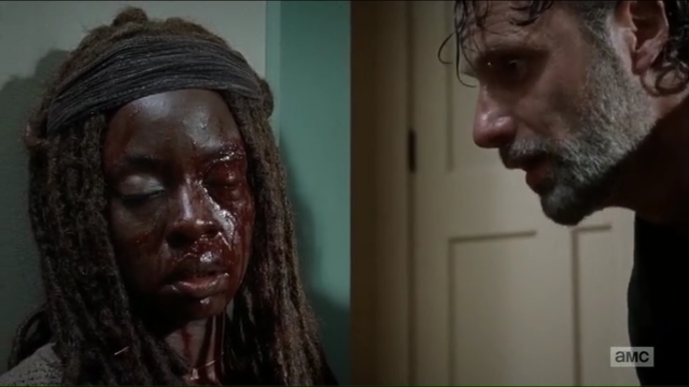 Rick later finds a bloody and beaten, but still-alive Michonne.