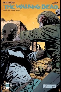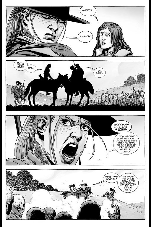 But even if it turned out to be a bite mark after all and it happened off-panel, Andrea isn’t bogged down by it. Everyone has reason to be concerned, but there are bigger concerns to deal with between the walker herd and the Saviors. So my hope is that even though her life is on the clock, Andrea goes out fighting. Based on how this issue ends and looking at the cover for the next one, that may not be the case, but we’ll get to that.