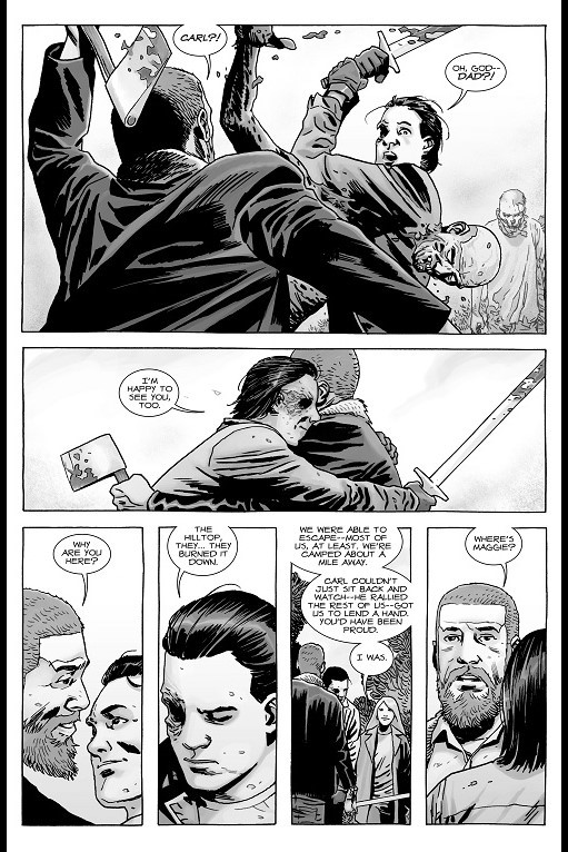 And in the middle of it, we get a Carl and Rick reunion, which is nice as Rick now learns how his son has been leading some of the Hilltop residents in battle. More than that, I like how Rick immediately wonders where Maggie is, especially given the Hilltop’s fall. Sure, Carl is good at leading, but losing Maggie would a huge setback for everyone, so of course Rick is going to be concerned for her.