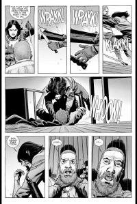As I said, there’s still that hostility factor, and it’s cranked up to 11 when Sherry starts slapping Rick. She says that Rick calling her crazy justifies this, but we know that she’s been planning all along to try and take over Alexandria. Killing Rick would just be icing on the cake. And it’s on this page here that we’re just waiting for Rick to strike back so we’re not left looking at his face as he’s getting the life choked out of him.