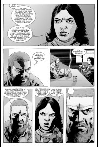 But then we get to the meat of this issue. The bulk of this read centers around Rick and Sherry trying to come to a mutual understanding. Well, Rick wants an understanding while Sherry is hostile from start to finish. And we’ve seen Rick lose his shit before, so I’m surprised that he’s so patient here. But then, he acknowledged that the Saviors hadn’t killed anyone, so maybe no need to lash out at Sherry just yet.
