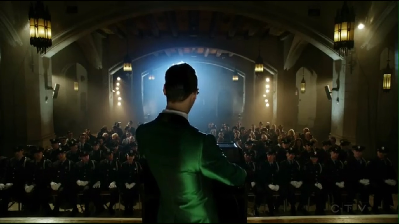 Just before Bullock can address the new cadets, he comes face to face with Nygma, who is now decked out in a new, green suit. He’s here to give some remarks in Oswald’s absence. Just as Nygma sees that Bullock has received a call from Lucius, he springs into action and puts Bullock to sleep.