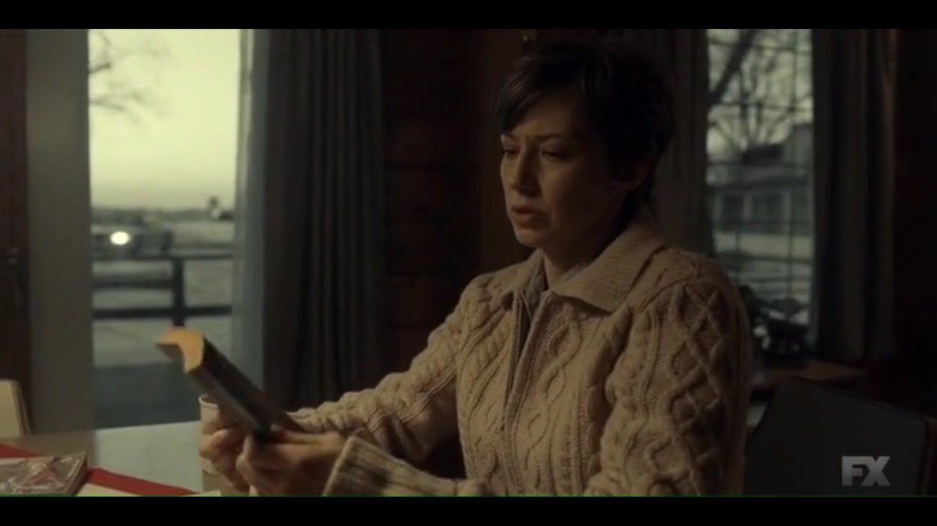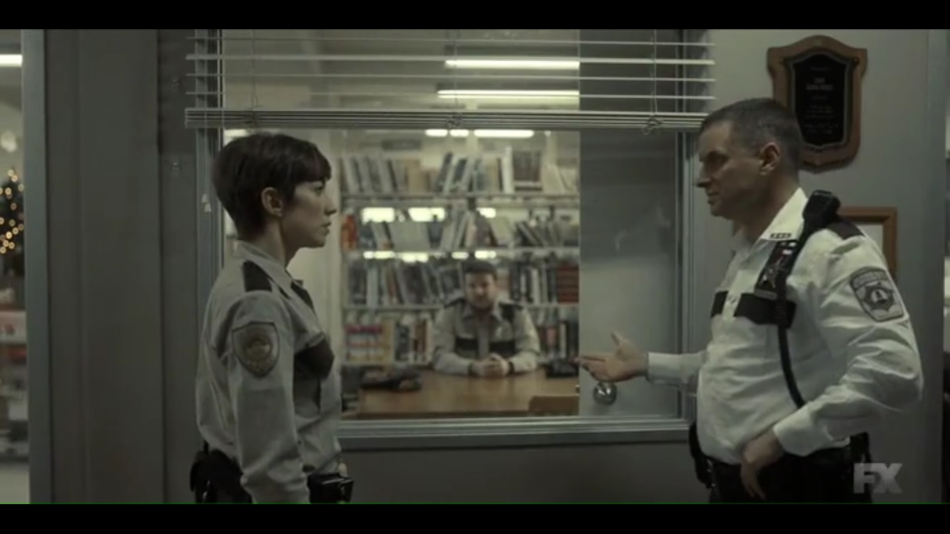 Soon, the two arrive at the police station, but Gloria once again is unable to get the automatic door working. Works fine for Donny, though. Technology is a dick to Carrie Coon.