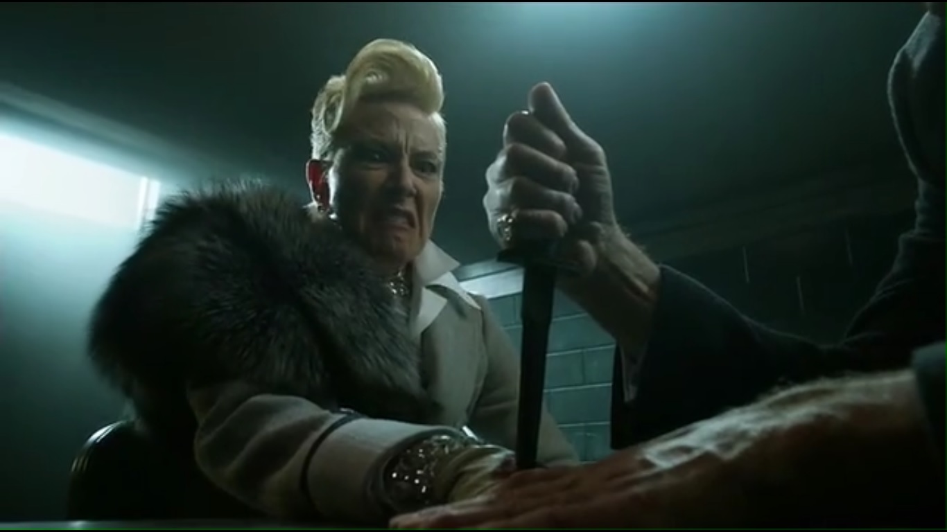 Alfred returns with the shattered owl- thanks, Jerome- and Bullock gives a call to someone who can rearrange it. But he also lets slip that Jim is interrogating Kathryn, so he storms into the interrogation room. A calm Kathryn isn’t up for a game of ‘good cop, bad cop,’ but as Alfred tells Kathryn, he’s not a cop. And with that, he stabs Kathryn through one of her hands.