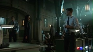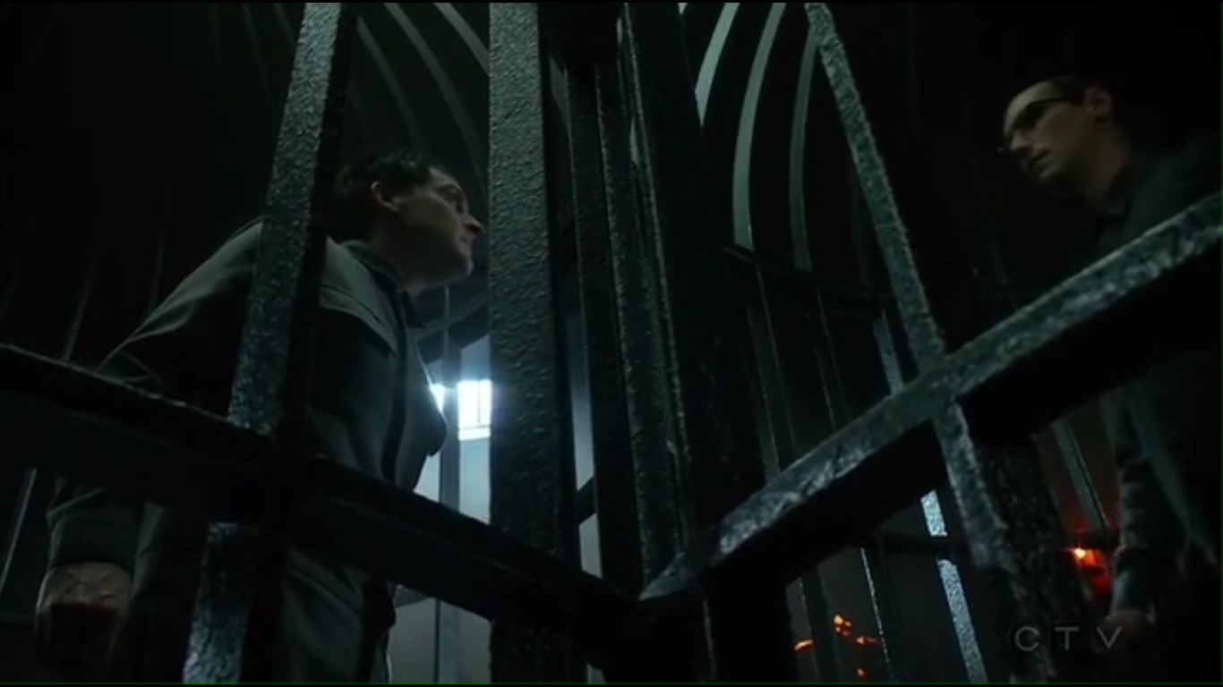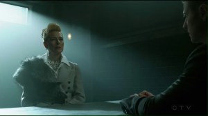 Jim finds himself chained to a chair in a courtroom with Barnes and Kathryn at his side. Kathryn laments having such faith in Jim, as he could’ve helped with Gotham’s future. She knows Jim took her key card to Hugo Strange’s lab, and since Strange said nothing about it, Kathryn will speak with him soon.