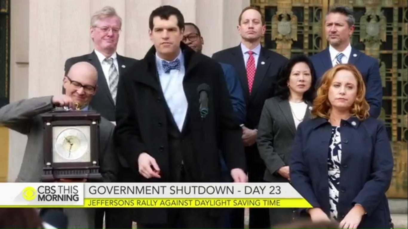 Over in the civilized part of the country, it’s Day 23 of the government shutdown and Jonah tries to commemorate this by smashing a clock, but ends up hitting Congressman Clark’s foot instead.
