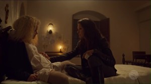 At the aforementioned convent, Sarah reunites with Helena while S goes off elsewhere. Helena tells Sarah that the woman doesn’t talk because her tongue was taken- she’s called the Blasphemer. Helena senses that Sarah’s heart is heavy, so she beckons her to sit down to talk.