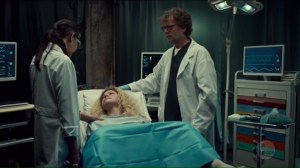 Because these doctors are morons, they actually leave Helena alone, giving her time to grab a small pair of scissors and begin cutting through her restraints.