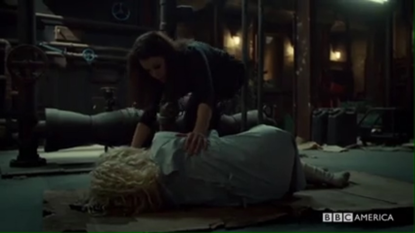 Well, she’s on her back and in pain, but doesn’t want to have the baby right here, even though Sarah insists that there may be no choice. Sarah gives Helena a blade before heading off for any kind of help.