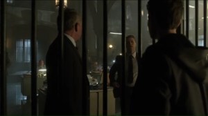 At the police department, Alfred comes to pick up Bruce, and expresses his doubts that Bruce would’ve been able to handle these robbers on his own. Bruce tells Jim that he dropped in on a robbery in-progress, and he was on the roof because he was looking for Selina. Seems plausible. Jim springs Bruce loose and wants to discuss this later, but not tonight.