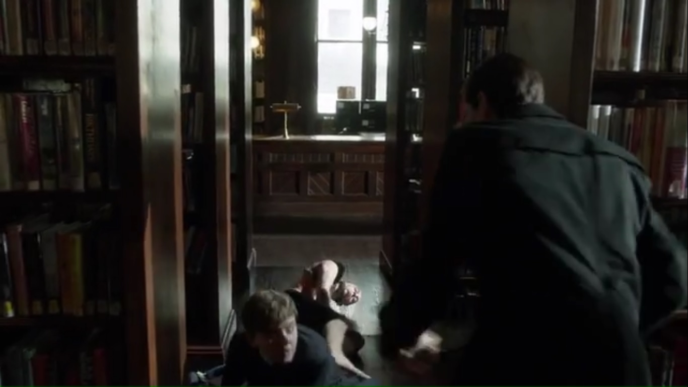 Jim and Bruce arrive at Gotham Central Library and head to the records’ room. Alex opens the door and eventually lets Bruce and Jim in, he then asks Bruce if he knew that the knife was dangerous. Alex doesn’t want to cooperate since this killer may come after him, but then there’s a commotion in the library. While Bruce takes Alex to the station, Jim is ambushed by Barbara’s henchmen.