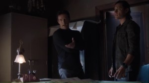 Downstairs, Fade, still livid about Reed’s involvement with Sentinel Services, tries to fight him, but John breaks it up. Okay, so Fade announces to everyone present that yes, Reed Strucker once worked for Sentinel Services.