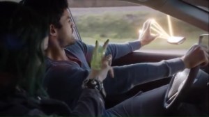 As the drone approaches them on the road, Lorna can’t user her powers on the drone because it’s out of range, so instead, she moves one of the rearview mirrors into position so Marcos can create a light beam that bounces up against the mirror and into the sky, where it destroys the drone.