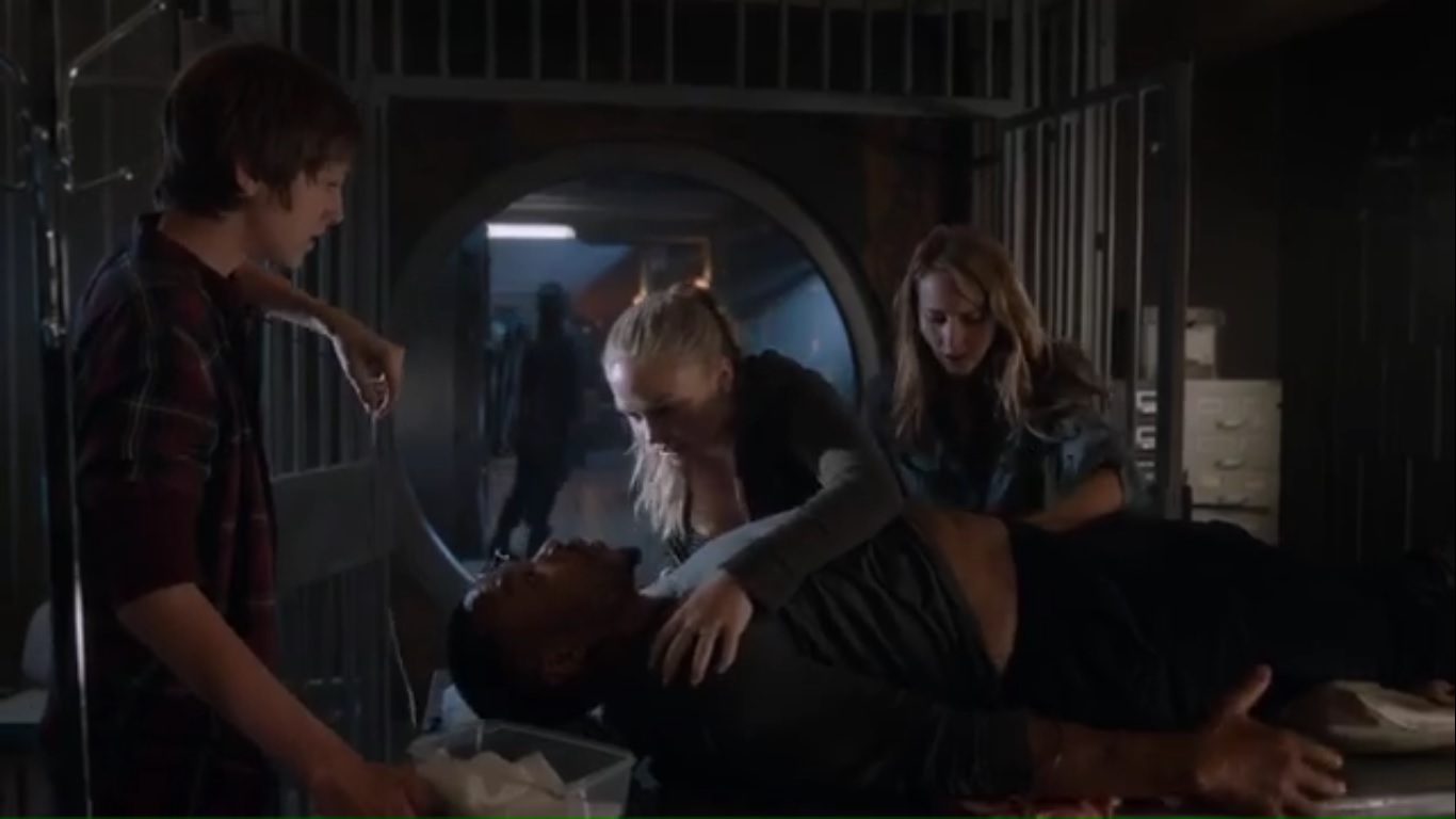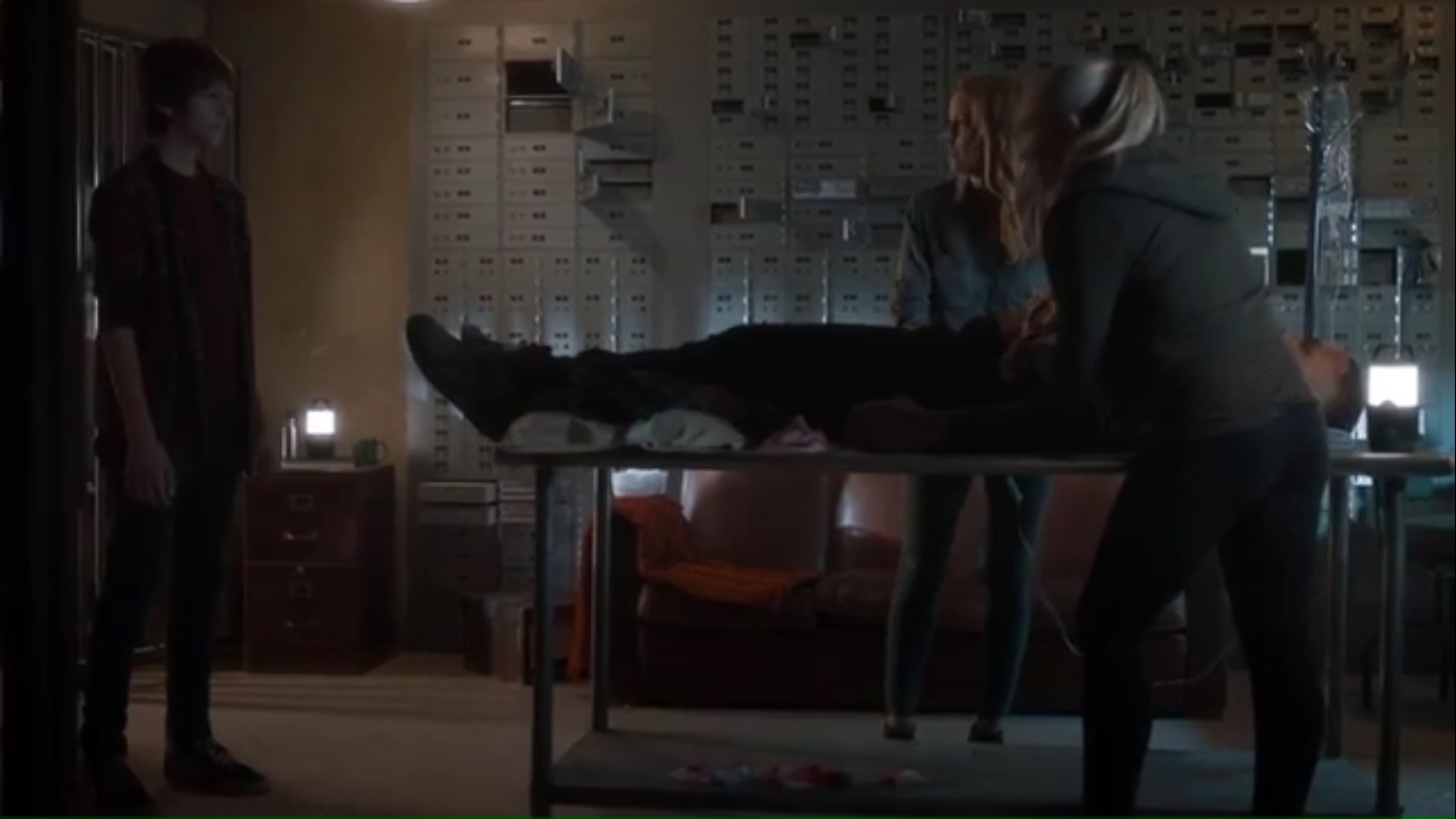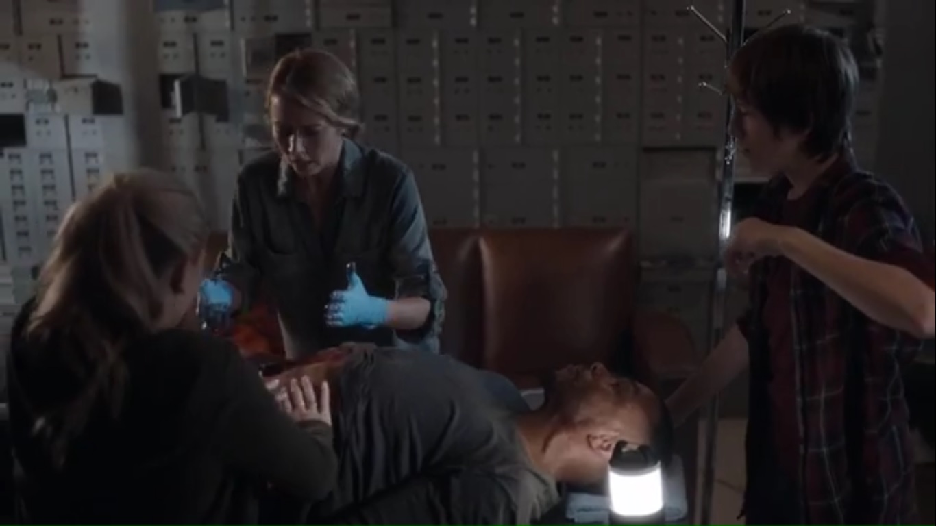 Back at the underground, Caitlin isn’t a surgeon, Jim, but she has to take the chance of removing the bullet. As Lauren keeps pressure on the entry wound, Caitlin works through Trader’s torso and pulls out the bullet. But then the bleeding continues as Trader starts hemorrhaging.