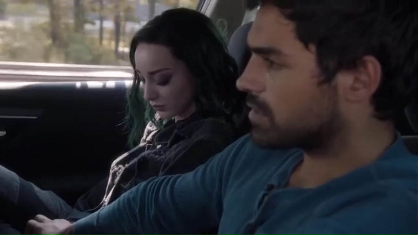 As the drone approaches them on the road, Lorna can’t user her powers on the drone because it’s out of range, so instead, she moves one of the rearview mirrors into position so Marcos can create a light beam that bounces up against the mirror and into the sky, where it destroys the drone.