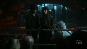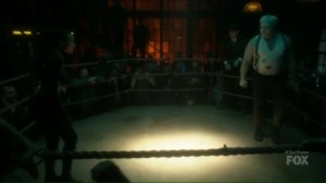 So the ladies must put up their best fighter to go against Grundy. In the ring, Nygma again puts on his Penguin impersonation and tells the crowd that tonight is a special match. The winner gets him. So it’s Solomon Grundy versus Tabitha, who, despite her clear hesitation, is confident that Butch won’t hurt her.
