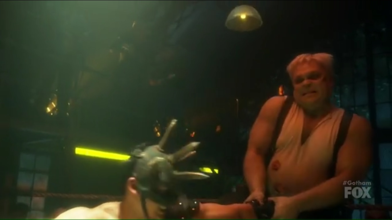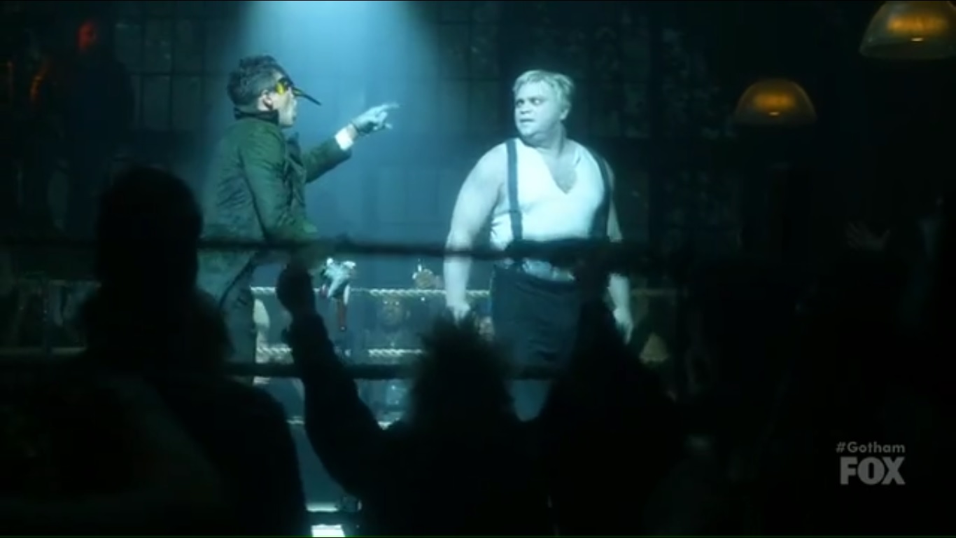 The episode begins at the fight club with Nygma and his Penguin impersonation taking center stage. The crowd gives energetic boos to Nygma and his cronies, as they want to see Grundy instead. So Grundy takes the stage and the lights die. Nygma reveals his true as it’s time for the event. Grundy’s challenge is Mr. Murderface.