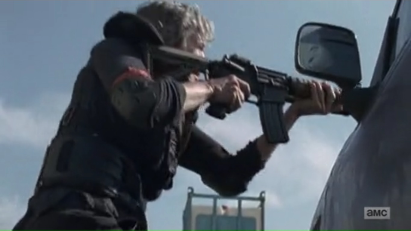 Carol manages to subdue a Savior, but the others still shoot him dead just as Carol hits a button, opening a gate and allowing walkers to enter the facility. Their attention is divided while Carol grabs a machine gun.