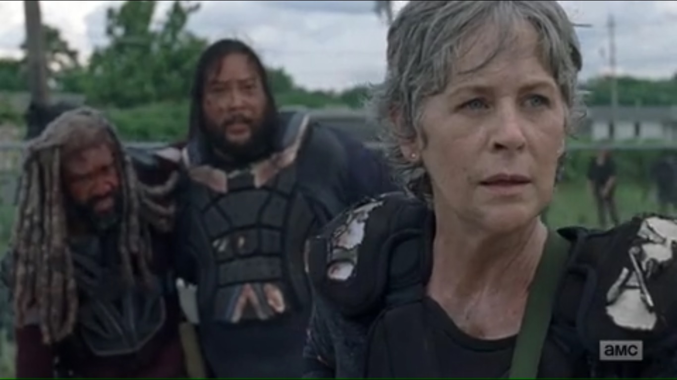 In the present, Carol chooses to save Ezekiel and Jerry at the risk of letting the Saviors go free. Ezekiel wants to get word to Rick, but according to Carol, those guns won’t be getting to the Sanctuary.