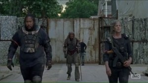 The Saviors tell her to walk away, but she’s not letting them leave with the guns. They dare her to approach, but then she spots Jerry and Ezekiel fighting for their lives at the gates.