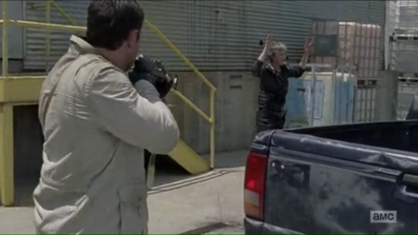 Despite being outnumbered, Carol springs into attack, but the Saviors open fire and force her to wait behind a truck from all the gunfire.