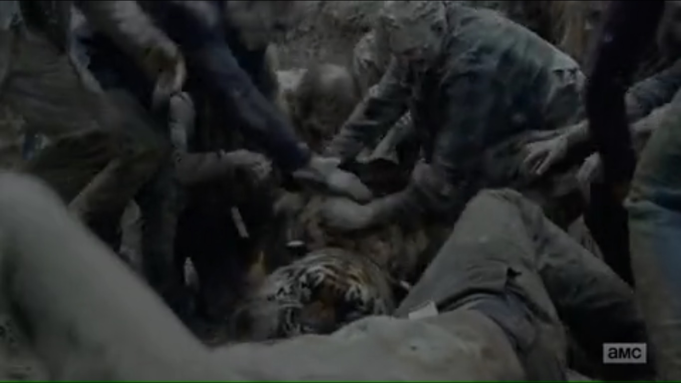 Then Shiva swoops in and saves the day, but is overrun by walkers and devoured as her blood mixes with the water.