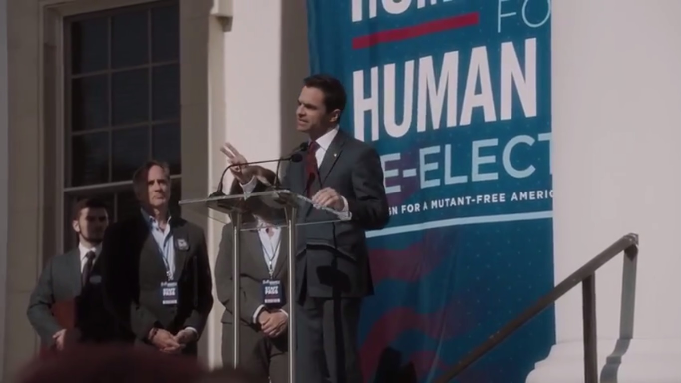 The episode begins with a flashback two months ago at a political rally as Senator Matthew Montez, played by David Norona, talks about the growing mutant population that threatens American values and rights. Mutant crime is high and getting worse. Montez has created laws to stop those who would use their powers to do harm. If reelected as Senator, Montez pledges to win this fight against mutants.