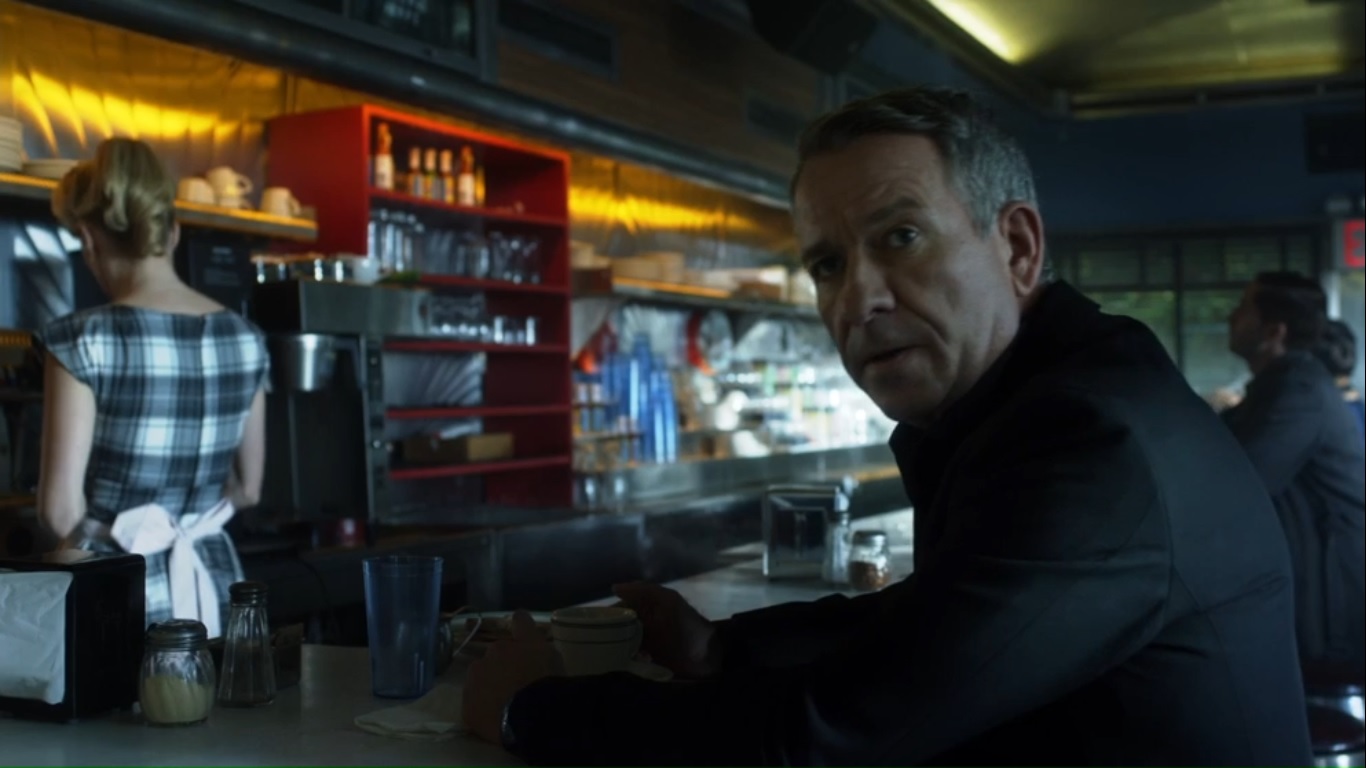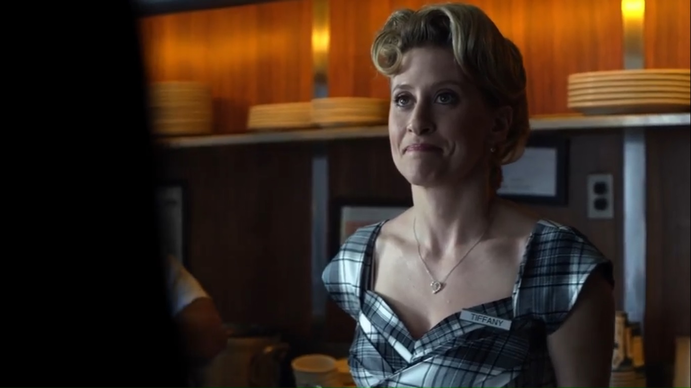 Alfred arrives back at the diner and is greeted with applause and even given a complementary drink on the house from hostess Tiffany Gale, played by Caissie Levy. Even the man who tried to rob Alfred congratulates him for running into a burning building and saving others. In the midst of all this, Alfred notes a bruise on Tiffany’s temple and asks what happened, but she brushes it off.